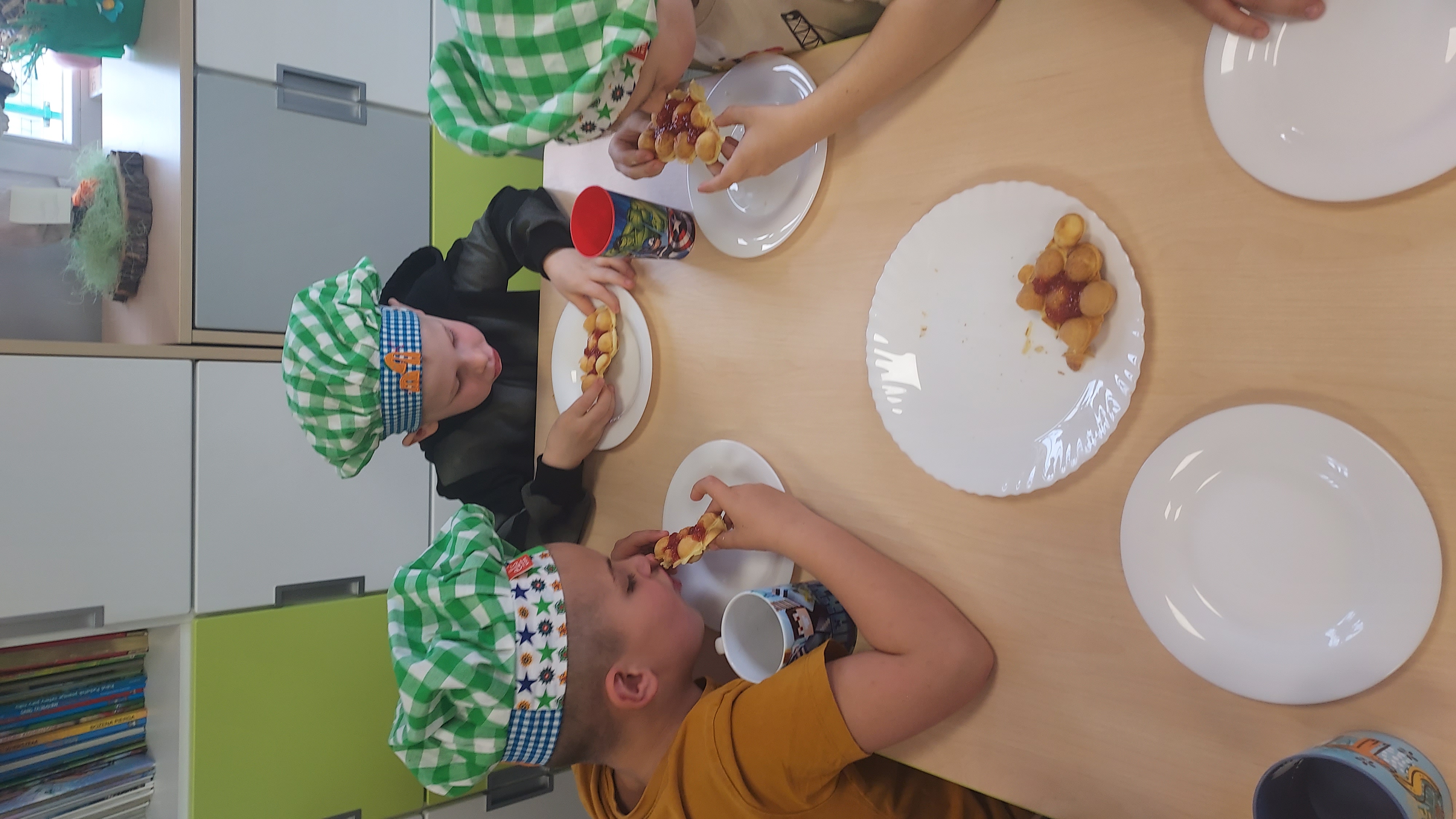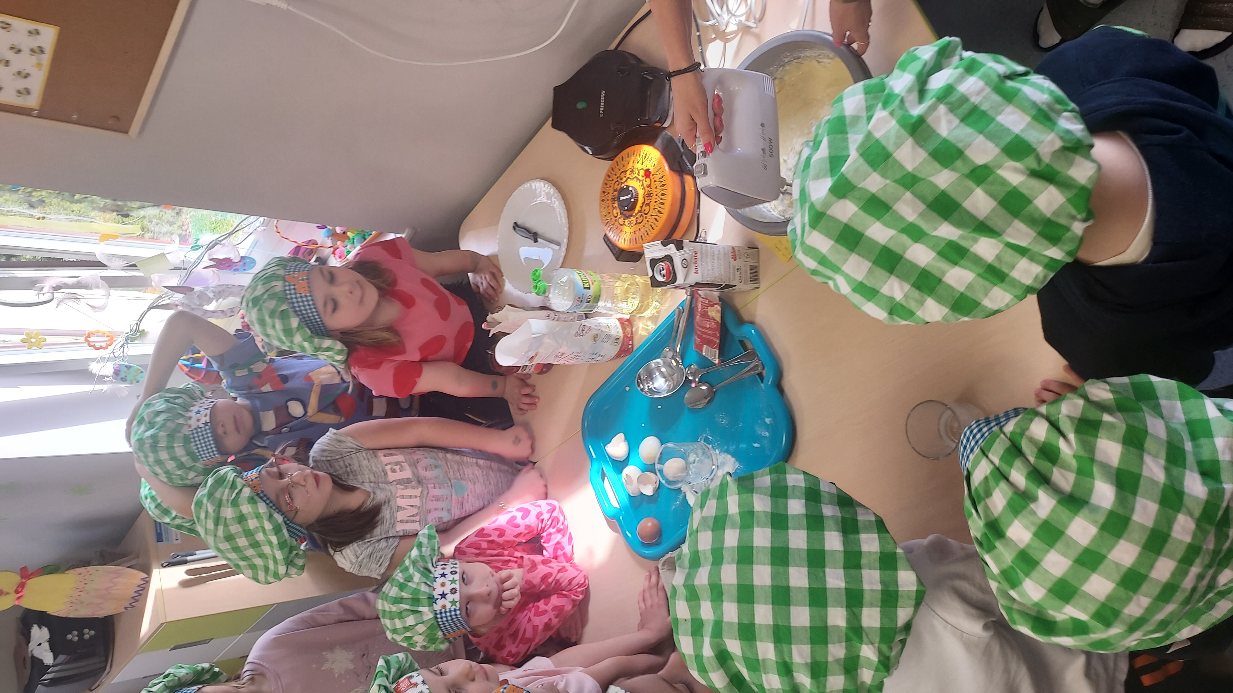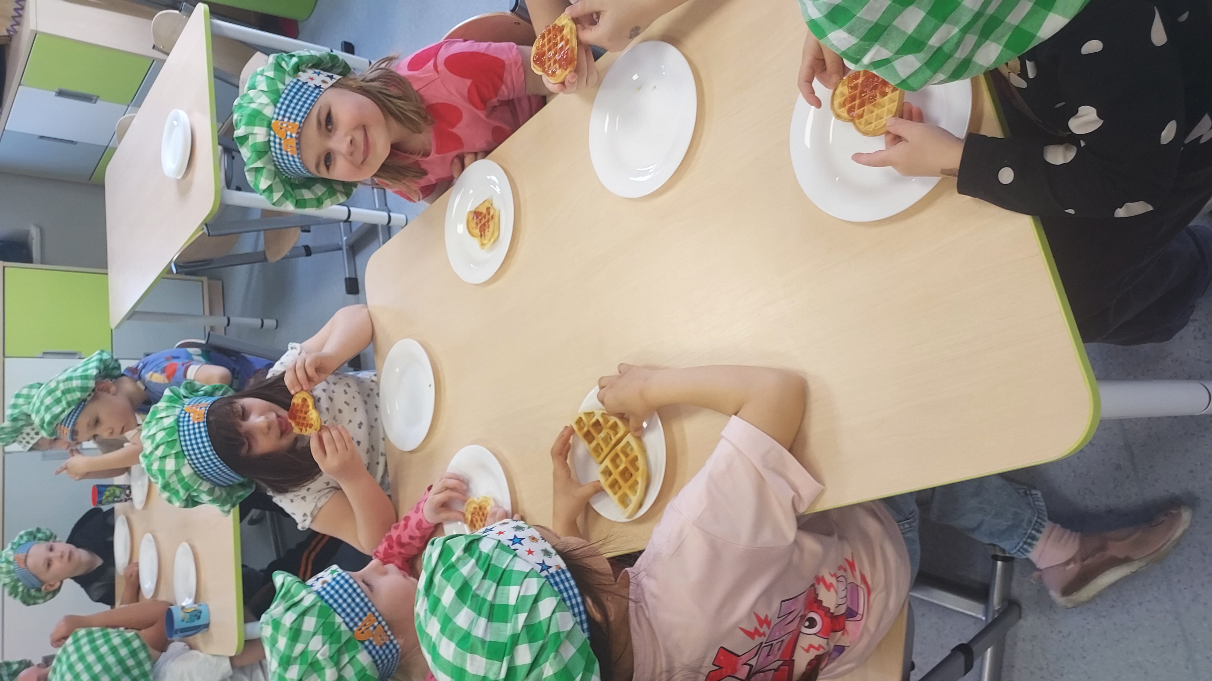 Podczas warsztatów kulinarnych przedszkolaki z Szymanowa zrobiły ciasto na gofry. Najpierw wymieszały produkty, a potem z cierpliwością czekały na upieczone, pachnące przysmaki. Muchomorki postawiły na klasykę i najbardziej sobie upodobały gofry z dżemem i z cukrem pudrem. Palce lizać, było wesoło i przepysznie!!!
