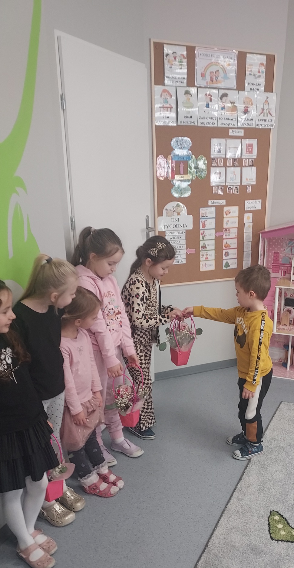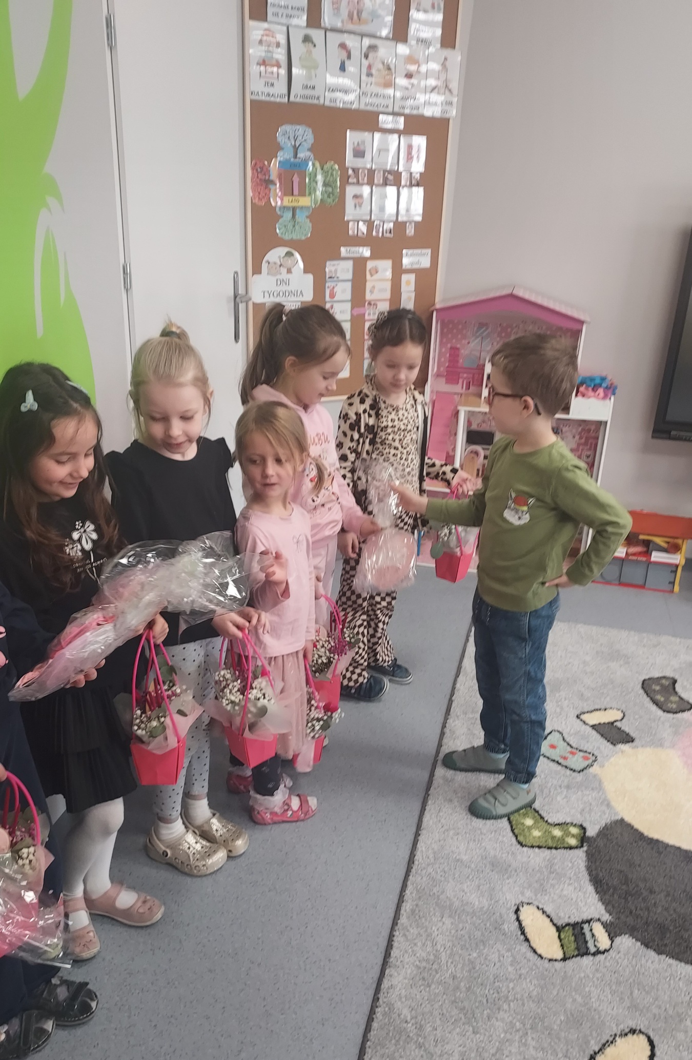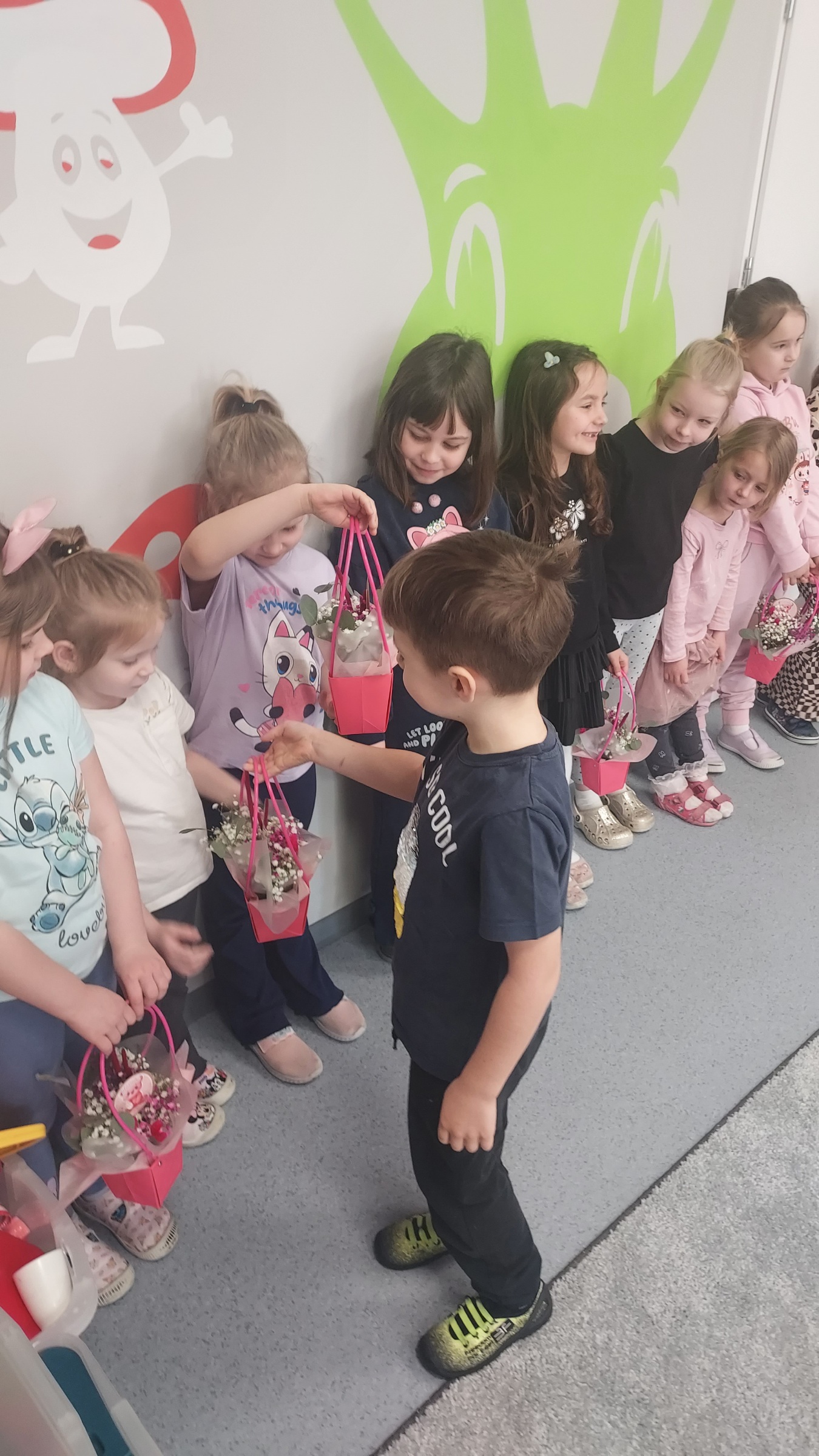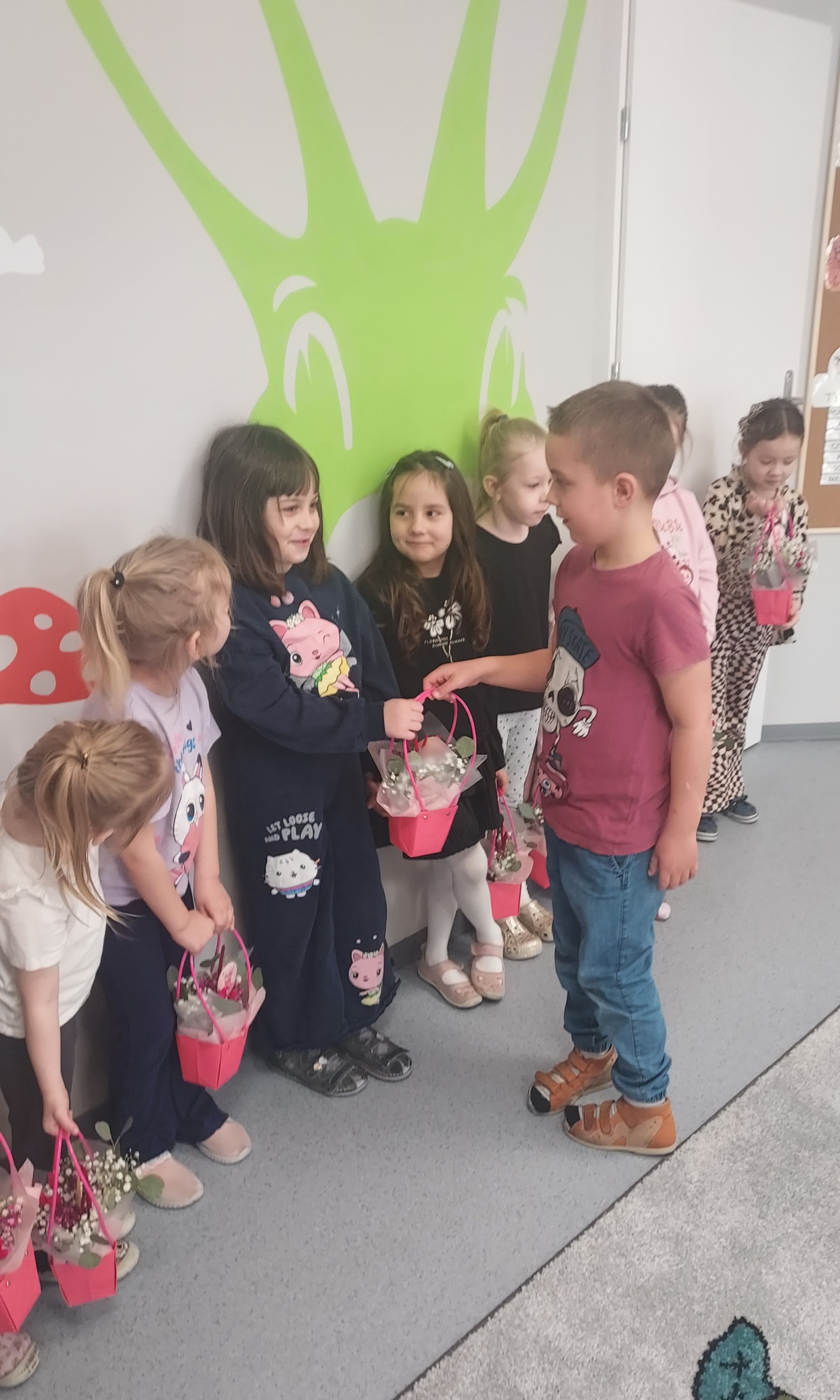 Chłopcy z grupy Muchomorki jak co roku pamiętali o swoich małych kobietkach. Żłożyli życzenia, zaśpiewali sto lat i wręczyli przepiękne kwiatki i upominki. Obiecali ,że zawsze będą dla swoich koleżanek pomocni i mili, nie tylko 8 marca. Z kolei dziewczynki odwzajemniły się pięknym, szczerym uśmiechem. Kochane kobietki małe i duże , z okazji Waszego święta życzymy zdrowia, szczęścia i spełnienia marzeń !!