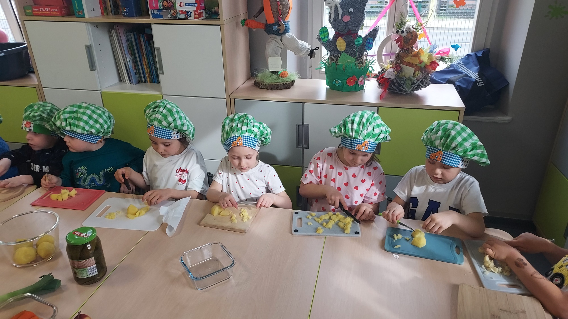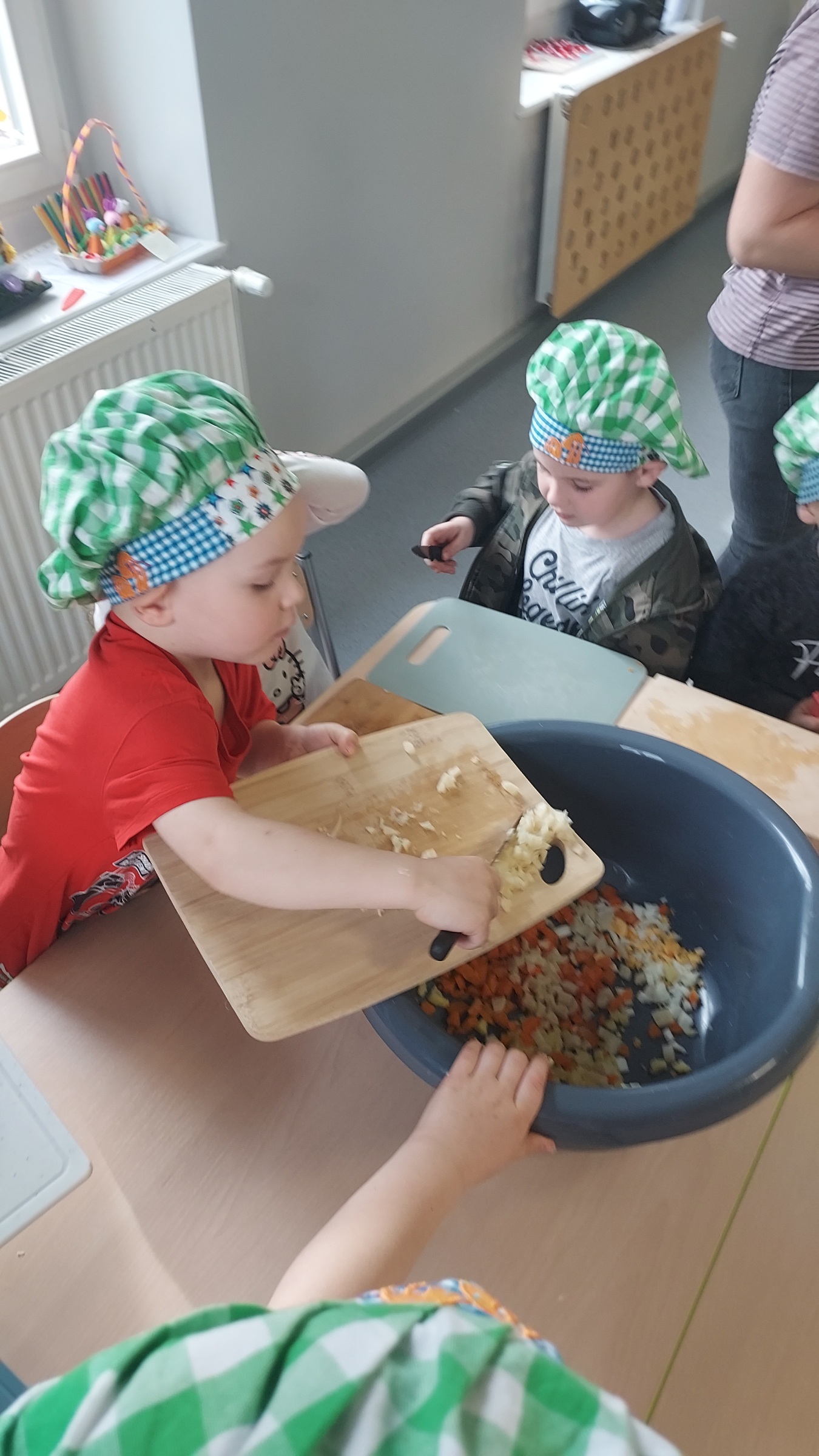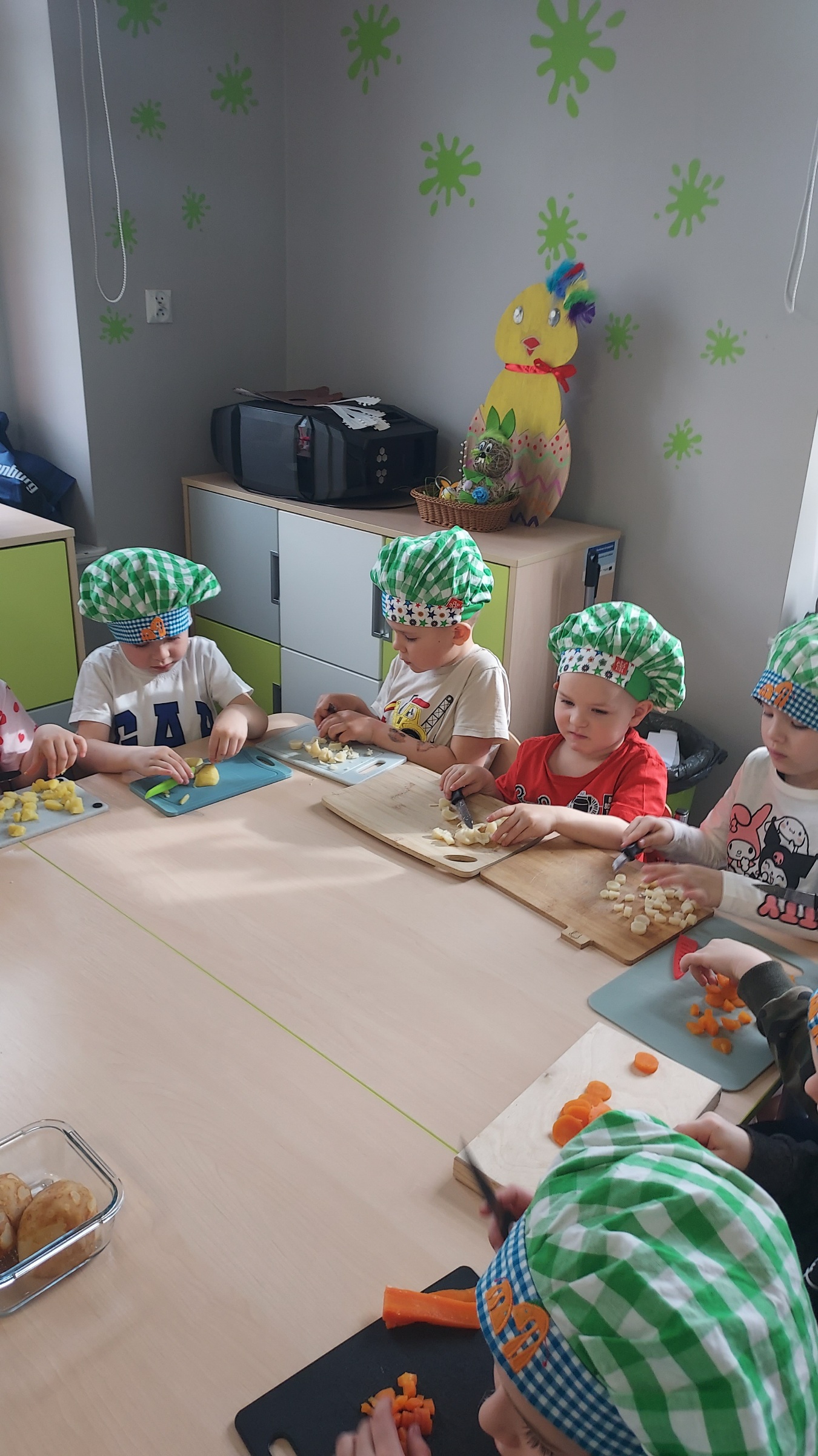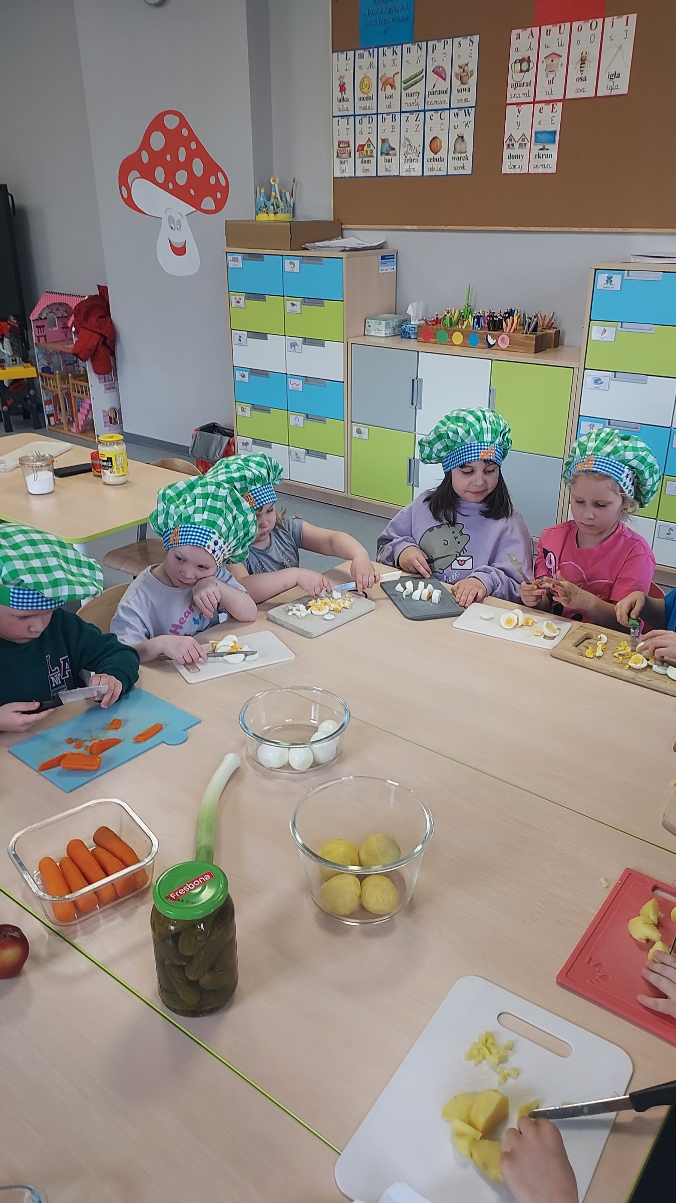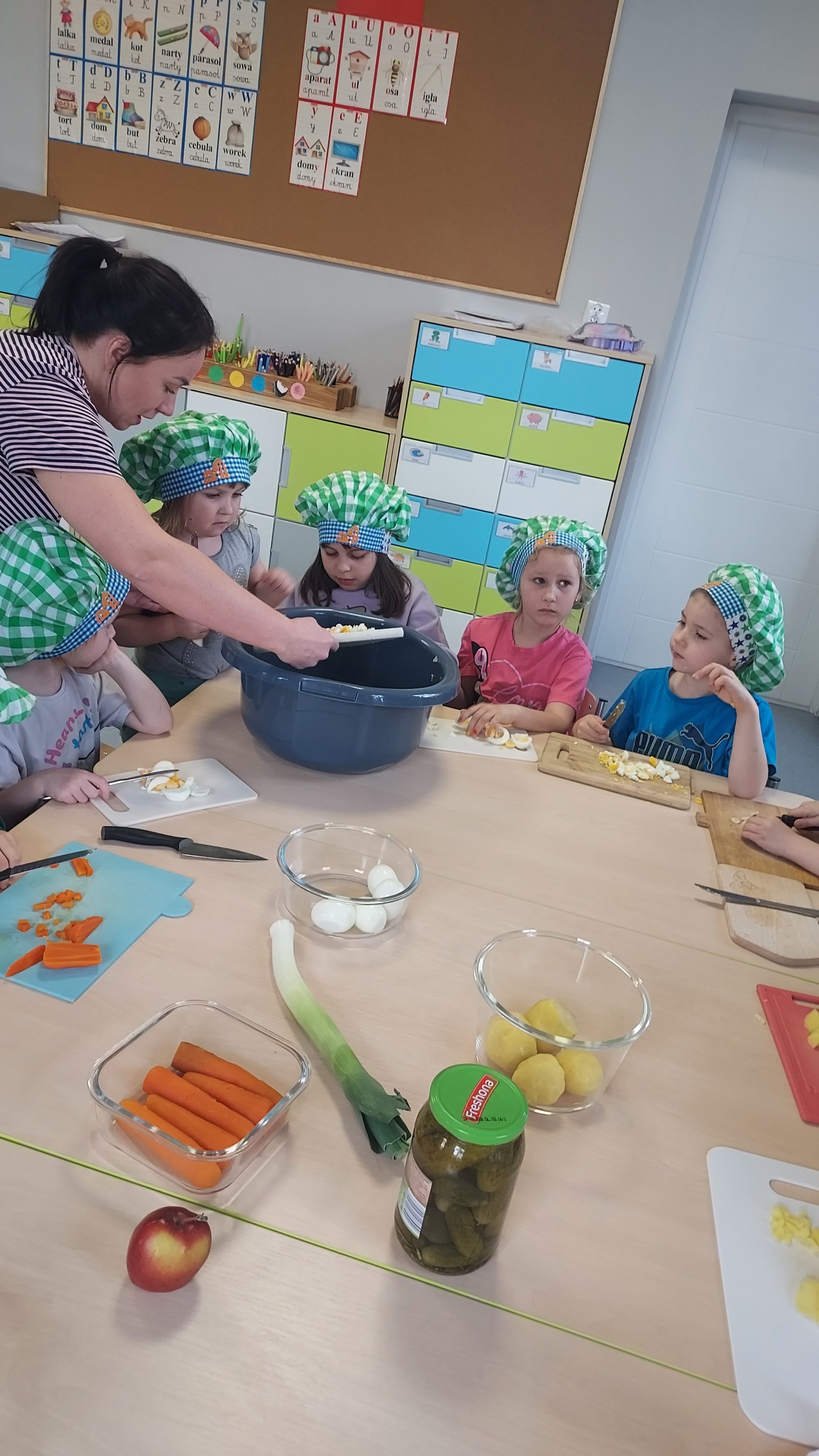 Przygotowania do Świąt Wielkanocnych u "Muchomorków" z Szymanowa idą pełną parą. Sala wysprzątana, zabawki poukładane i sałatka warzywna pokrojona. Przedszkolaki razem z mamą Malwinki wspólnie przystąpiły do zajęć kulinarnych. Z uśmiechem na twarzy kroiły ziemniaki, marchewki, pietruszki, ogórki, seler, por, jabłko oraz jajka. Potem dodały przyprawy, majonez, musztardę i już .... sałatka gotowa. Pani Dario bardzo dziękujemy !