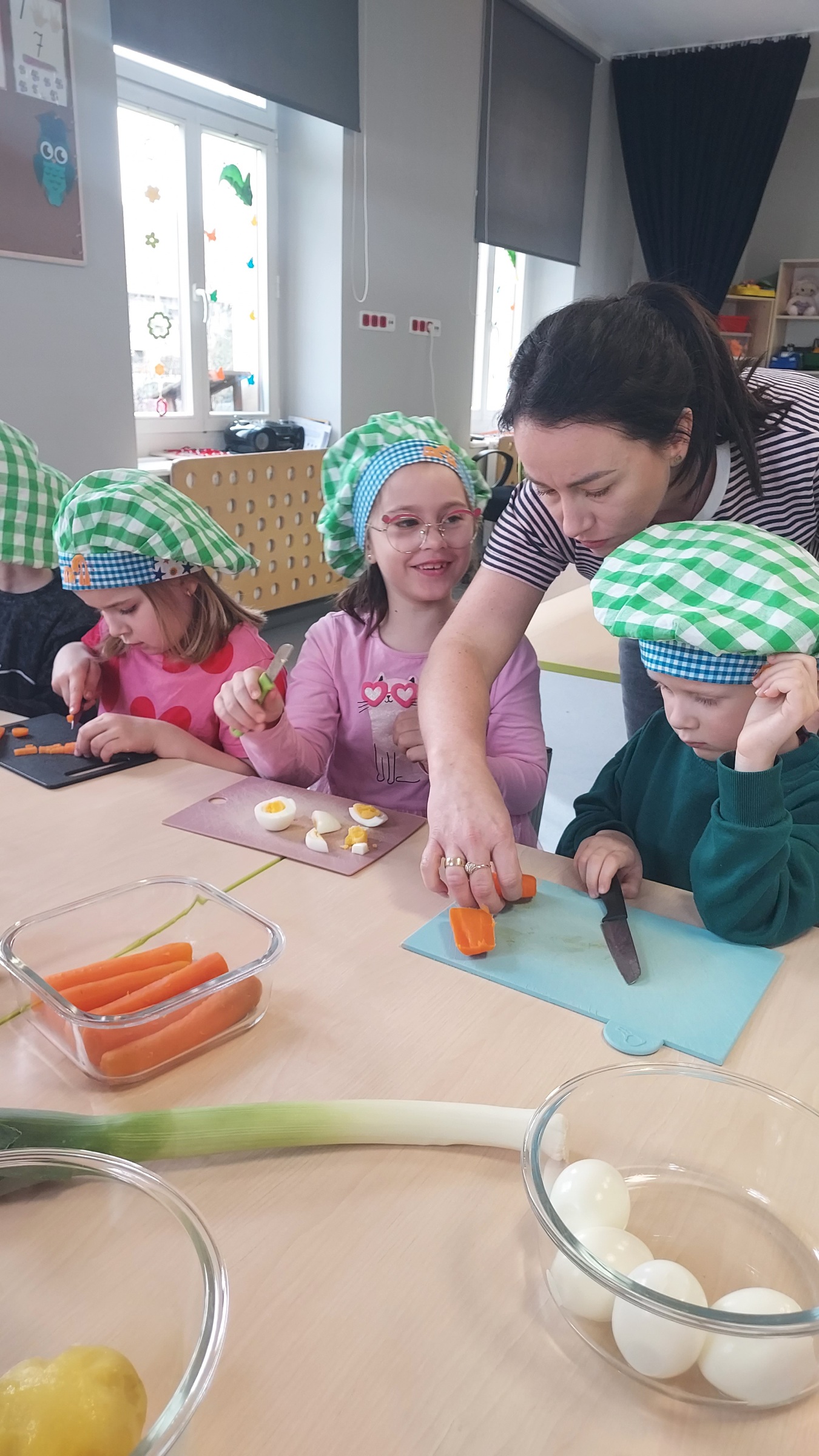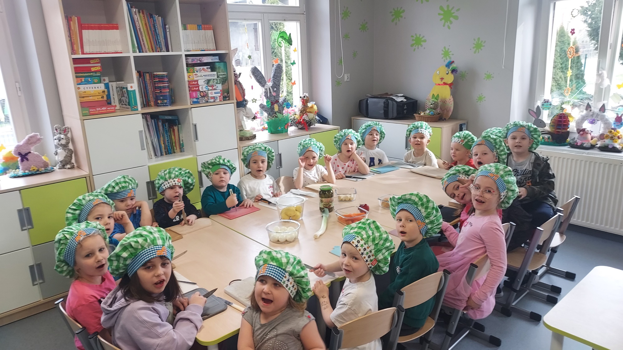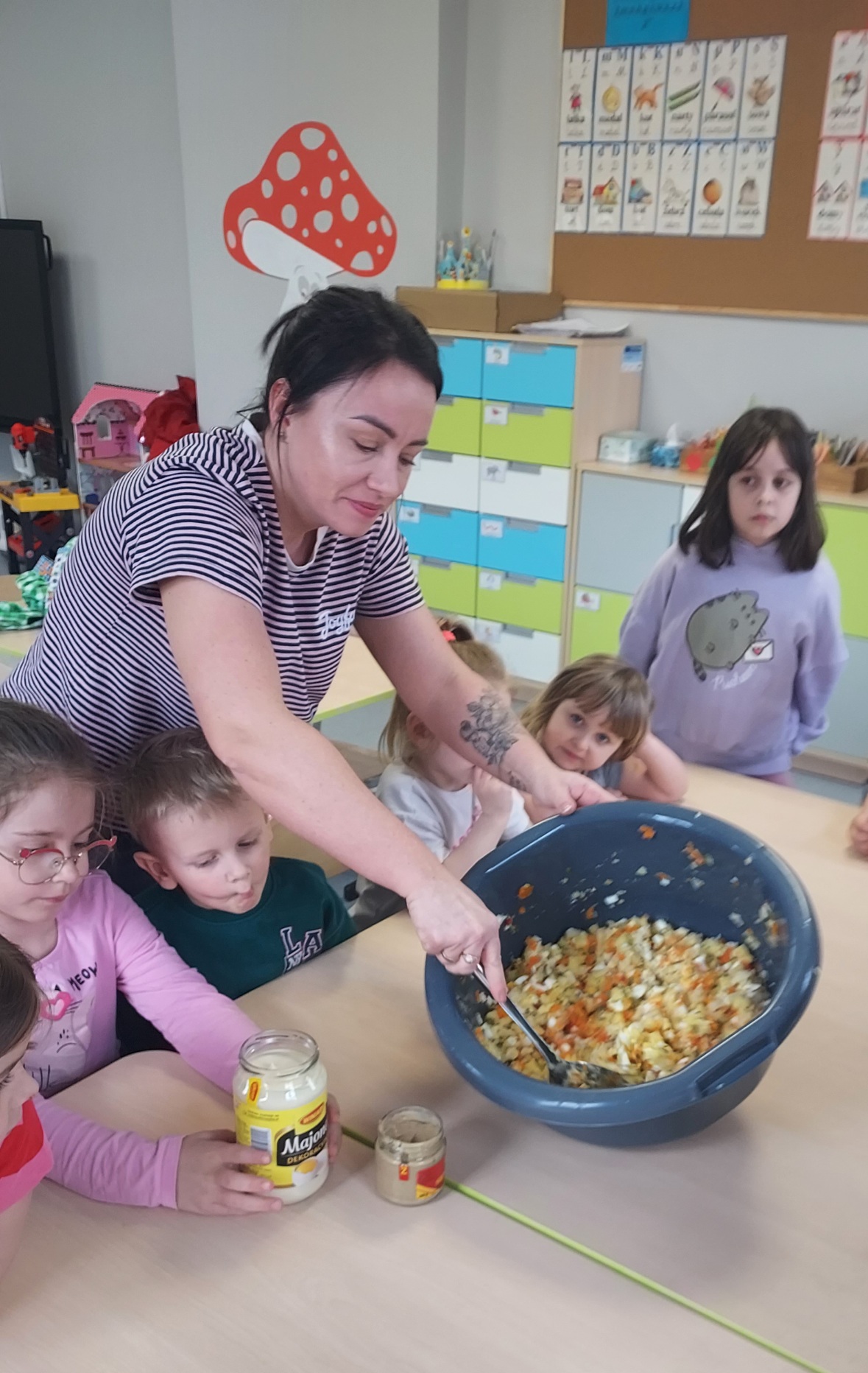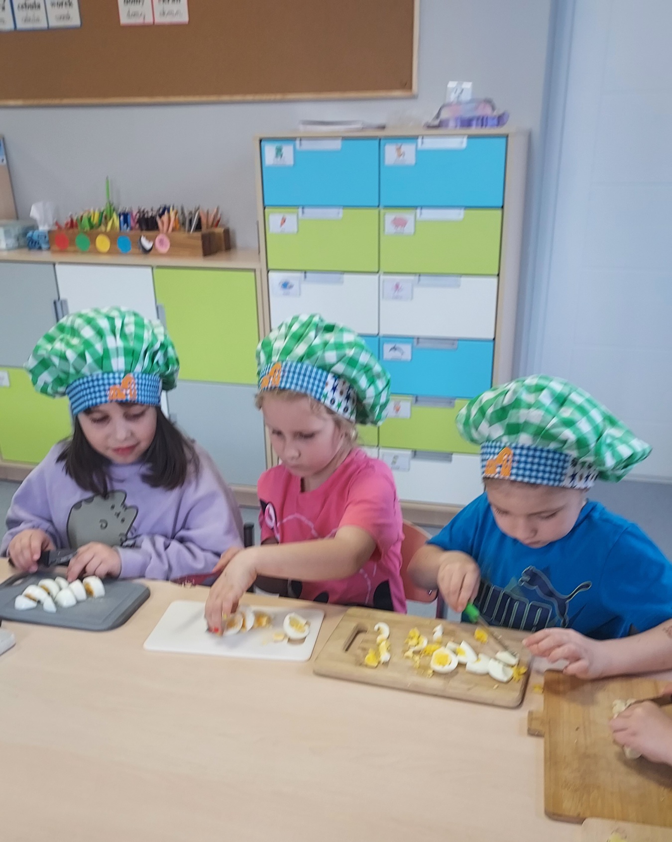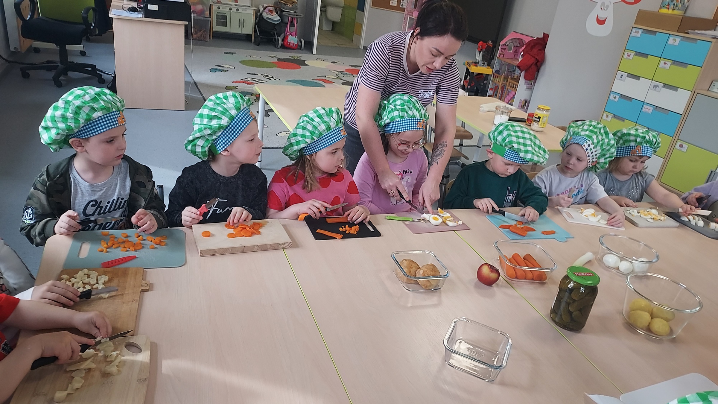 Przygotowania do Świąt Wielkanocnych u "Muchomorków" z Szymanowa idą pełną parą. Sala wysprzątana, zabawki poukładane i sałatka warzywna pokrojona. Przedszkolaki razem z mamą Malwinki wspólnie przystąpiły do zajęć kulinarnych. Z uśmiechem na twarzy kroiły ziemniaki, marchewki, pietruszki, ogórki, seler, por, jabłko oraz jajka. Potem dodały przyprawy, majonez, musztardę i już .... sałatka gotowa. Pani Dario bardzo dziękujemy !