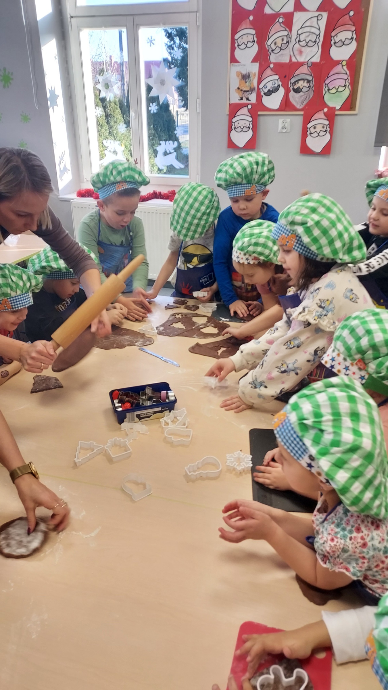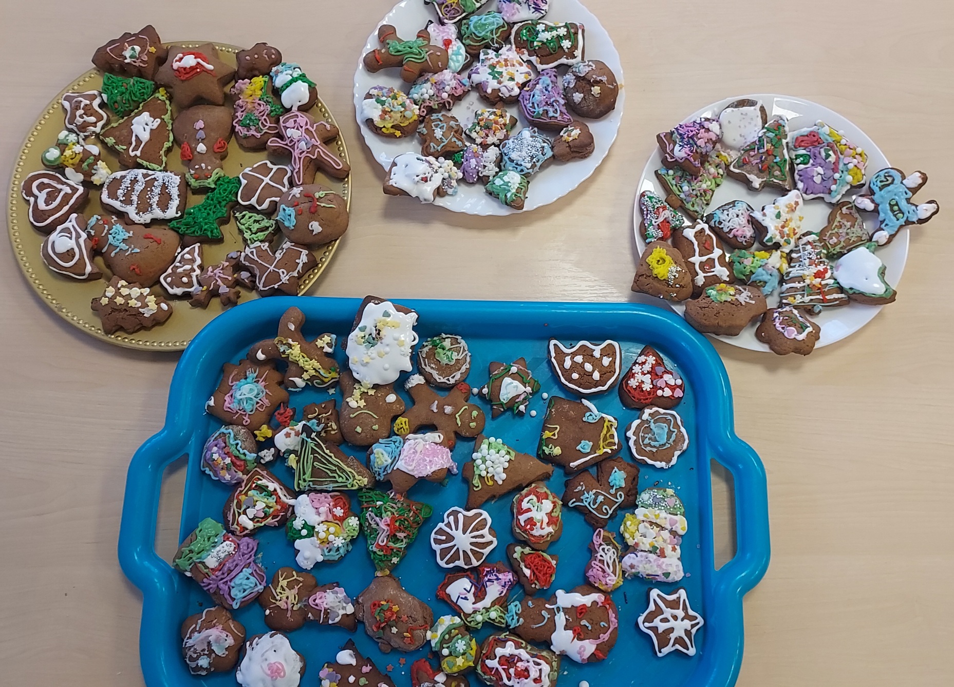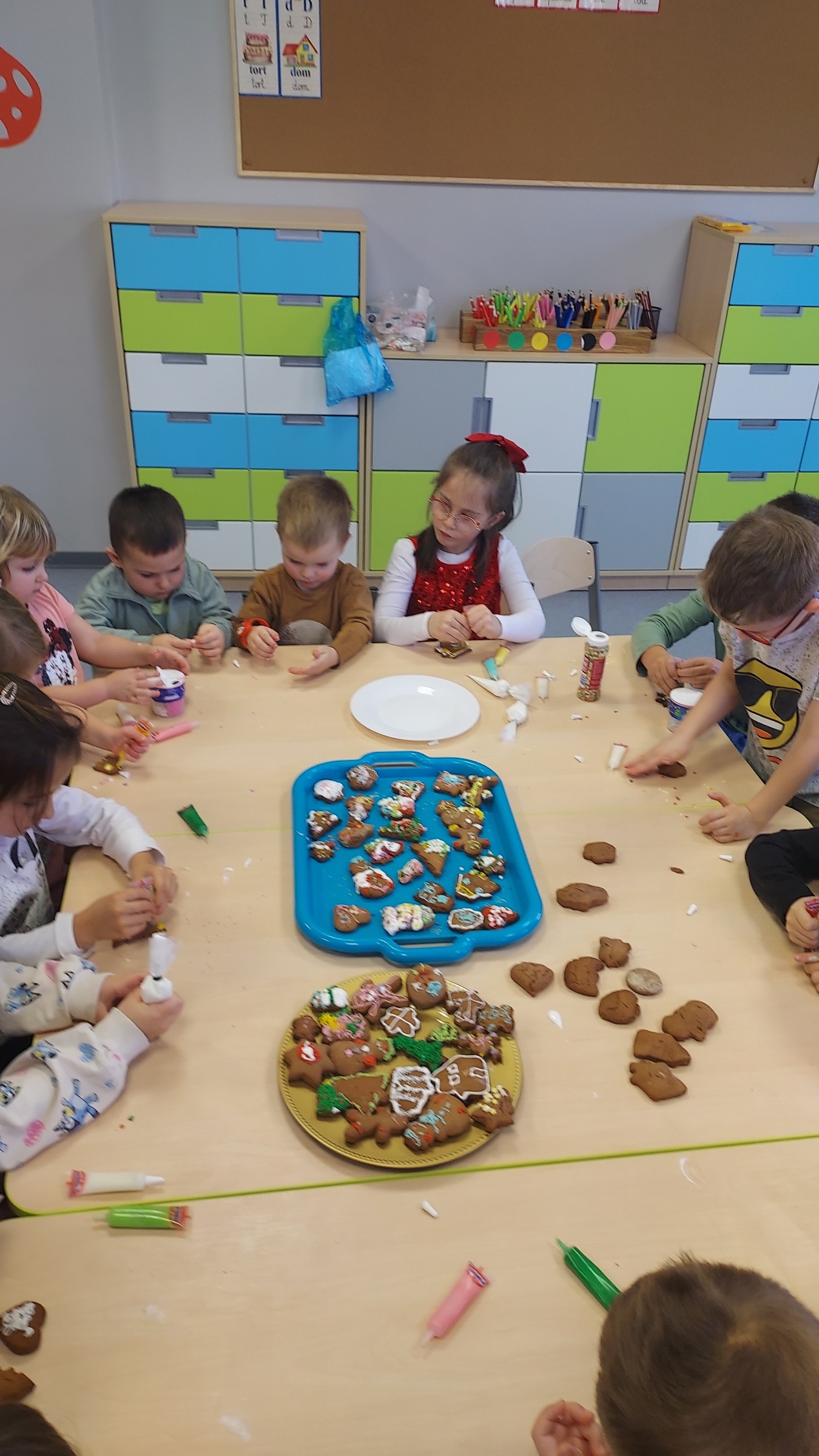W ramach programu "Godzinka z rodzinką" odwiedziła nas mama Klary. Jak co roku, podtrzymujemy tradycję świąteczną i wspólnie robiliśmy ciasto na pierniki. W całym przedszkolu czuć było ich zapach, a przedszkolaki przy śpiewie kolęd, dekorowały i lukrowały słodkie przysmaki. Magię świąt poczuły wszystkie Muchomorki, a najlepsze na koniec...degustacja. Przedszkolaki zajadały się pysznymi, kolorowymi piernikami...palce lizać. Pani Dagmaro bardzo dziękujemy za mile spędzony czas.