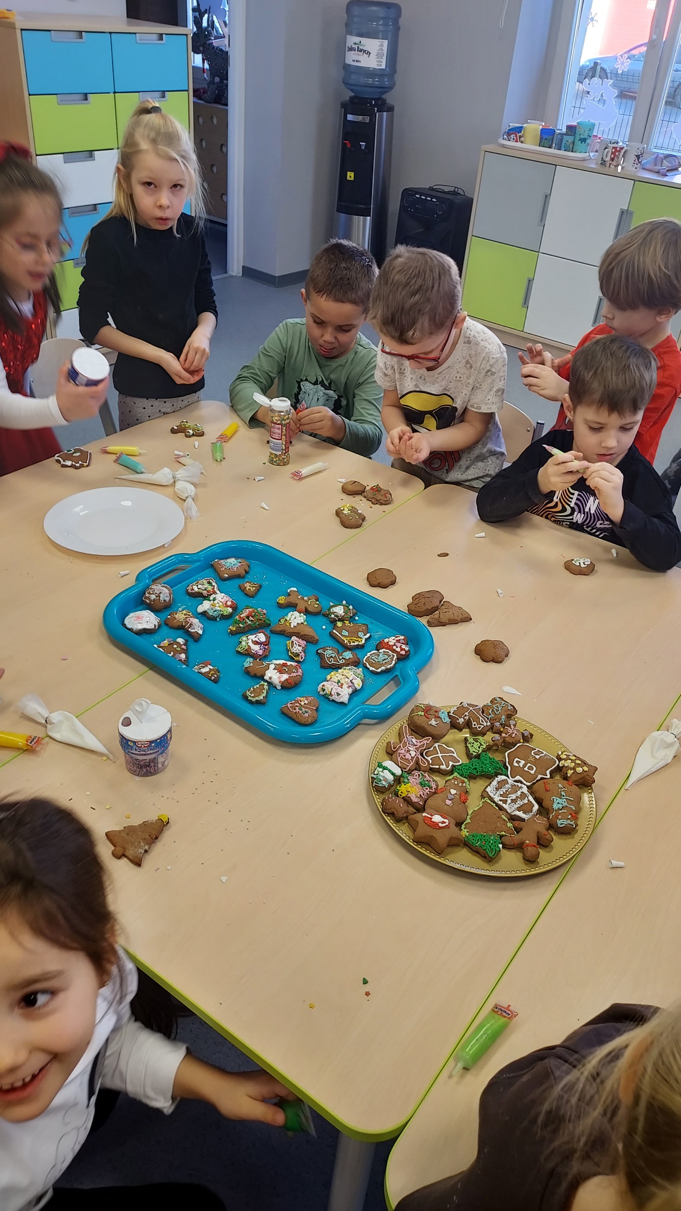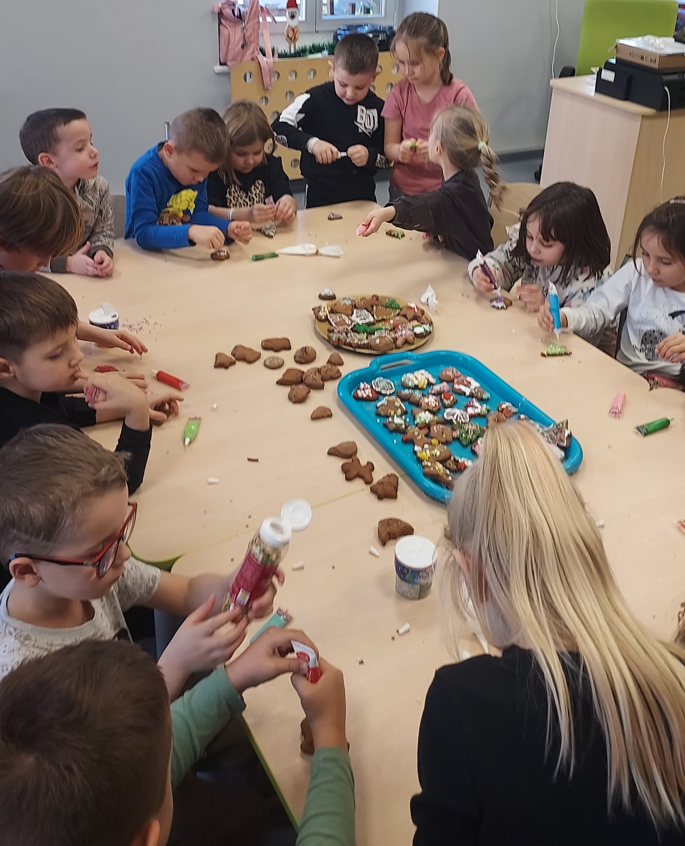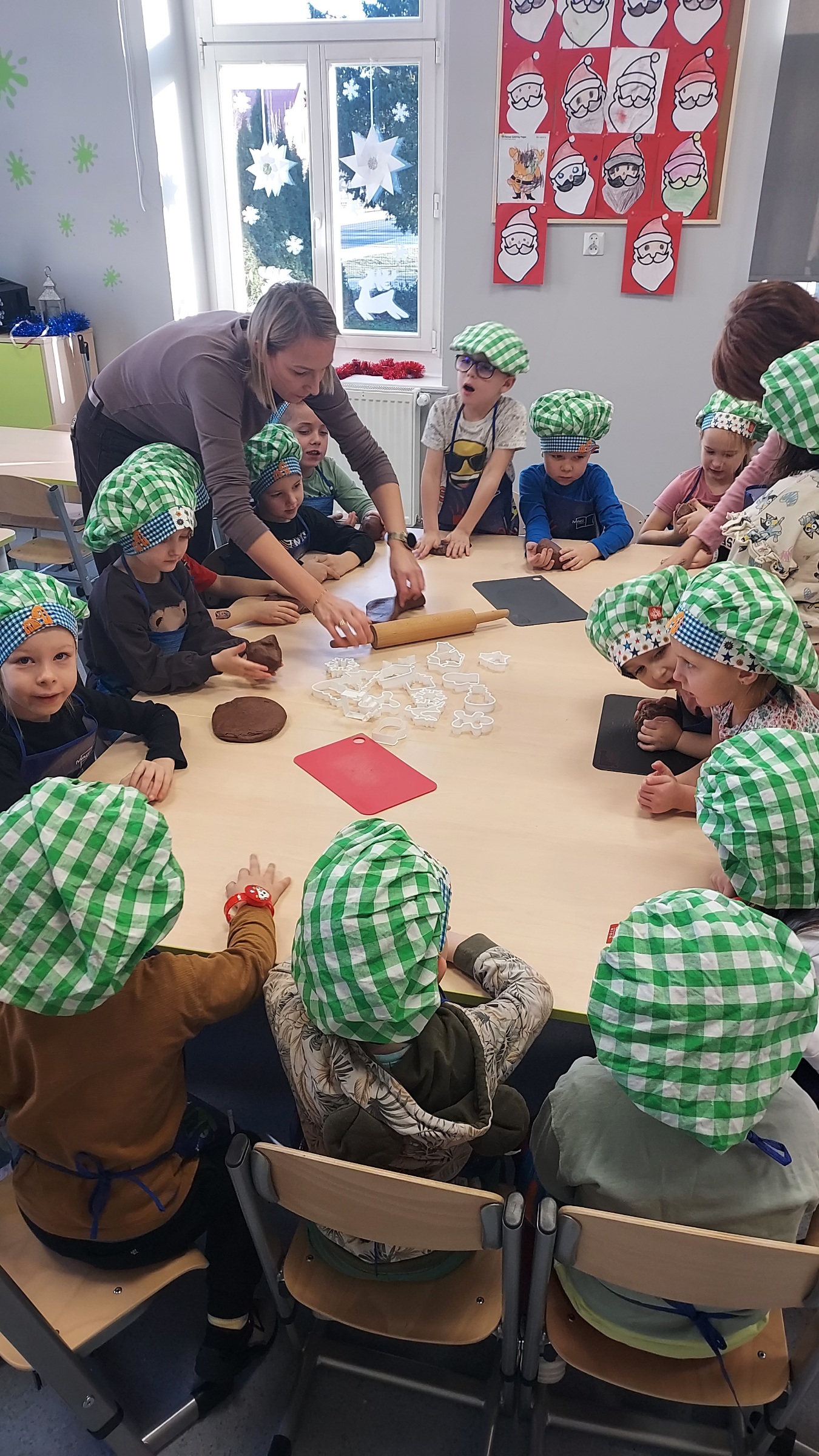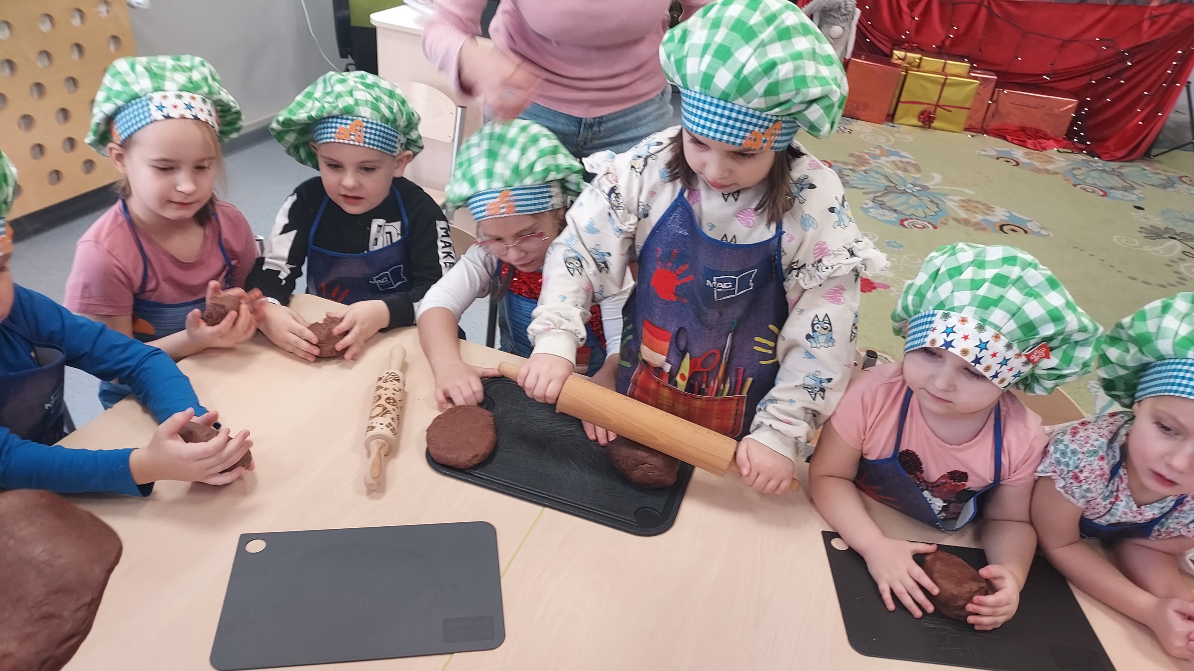 W ramach programu "Godzinka z rodzinką" odwiedziła nas mama Klary. Jak co roku, podtrzymujemy tradycję świąteczną i wspólnie robiliśmy ciasto na pierniki. W całym przedszkolu czuć było ich zapach, a przedszkolaki przy śpiewie kolęd, dekorowały i lukrowały słodkie przysmaki. Magię świąt poczuły wszystkie Muchomorki, a najlepsze na koniec...degustacja. Przedszkolaki zajadały się pysznymi, kolorowymi piernikami...palce lizać. Pani Dagmaro bardzo dziękujemy za mile spędzony czas.